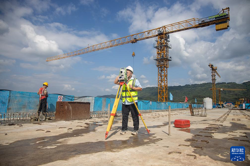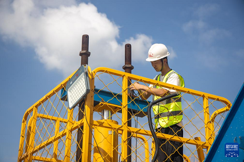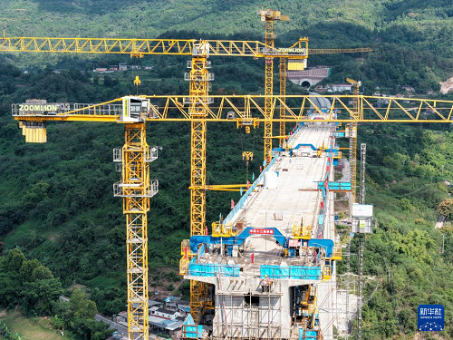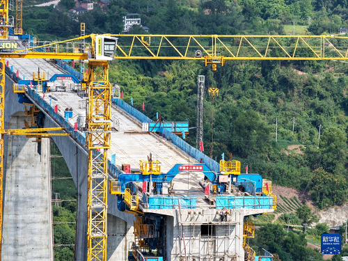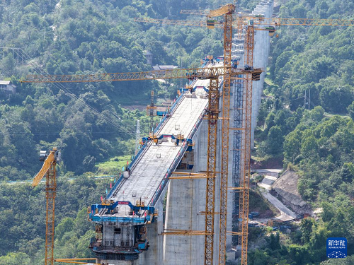 9月24日,工人在渝萬高鐵五步河雙線特大橋建設(shè)現(xiàn)場施工作業(yè)。(新華社記者 唐奕 攝)