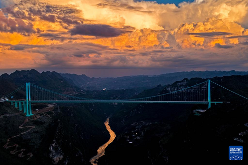 花江峽谷大橋是貴州六枝至安龍高速公路的控制性工程,大橋全長(zhǎng)2890米,主跨1420米,是目前世界山區(qū)峽谷第一大跨度鋼桁梁懸索橋;其橋面距水面垂直高度625米,超越北盤江第一橋成為新的世界第一高橋,被譽(yù)為“橫豎都是第一”。在不同時(shí)段的光線下,世界第一高橋呈現(xiàn)出不同的美景。