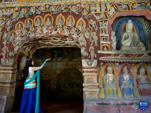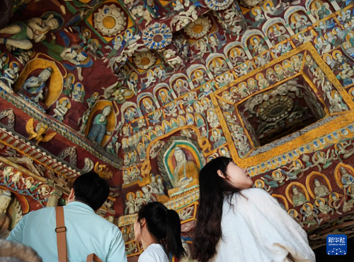 10月9日,在位于今潮8弄的戶外展區(qū),參觀者游覽云岡第12窟“音樂窟”的1:1復(fù)制洞窟。(新華社記者 劉穎 攝)
