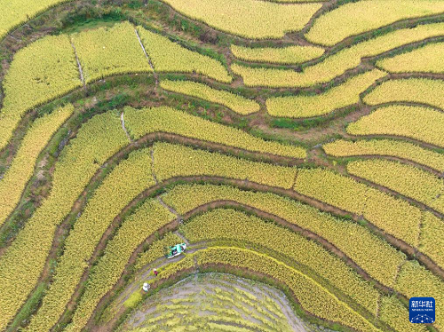 10月10日,湖北省宜昌市秭歸縣沙鎮(zhèn)溪鎮(zhèn)長春村村民駕駛農(nóng)機(jī)在田間收獲水稻(無人機(jī)照片)。(新華社發(fā) 雷勇 攝)