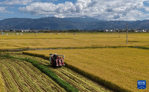 10月10日,工人在云南省大理市喜洲鎮(zhèn)水稻種植基地收割水稻(無人機(jī)照片)。(新華社發(fā) 梁志強(qiáng) 攝)