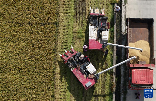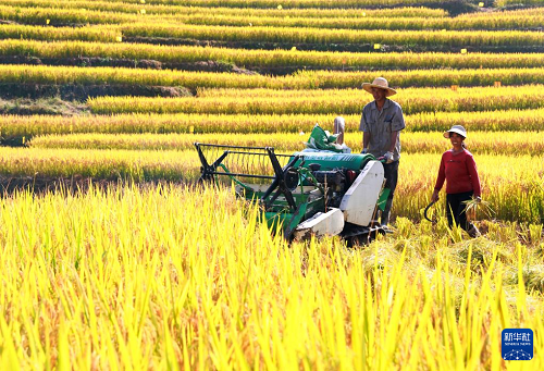 10月10日,湖北省宜昌市秭歸縣沙鎮(zhèn)溪鎮(zhèn)長春村村民駕駛農(nóng)機(jī)在田間收獲水稻。(新華社發(fā) 王罡 攝)