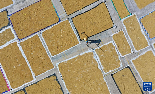 10月10日,浙江省臺(tái)州市仙居縣官路鎮(zhèn)增仁村農(nóng)民在晾曬稻谷(無人機(jī)照片)。(新華社發(fā) 王華斌 攝)