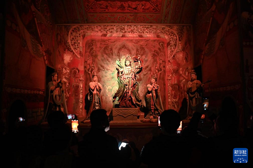 10月12日,參加“世界市長(zhǎng)對(duì)話·敦煌”活動(dòng)的中外嘉賓觀看洞窟式沉浸體驗(yàn)劇《樂(lè)動(dòng)敦煌》。(新華社記者 范培珅 攝)