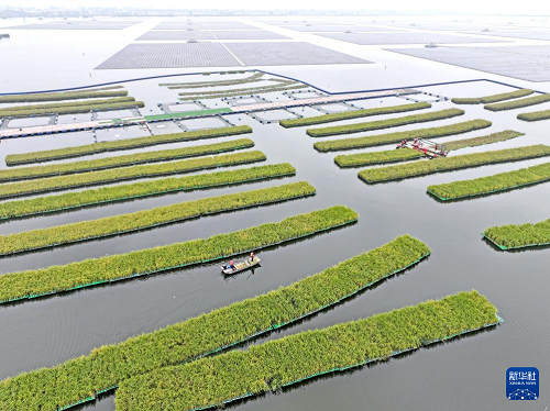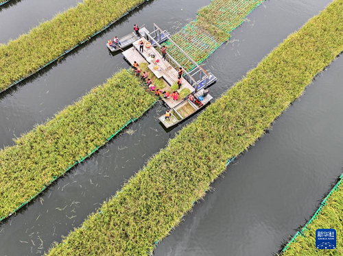10月14日,工人在淮南市鳳臺(tái)縣顧橋鎮(zhèn)采煤沉陷區(qū)水面上收獲漂浮式水稻(無人機(jī)照片)。(新華社發(fā) 陳彬 攝)