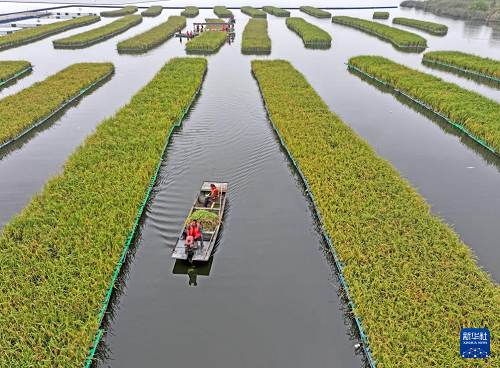 10月14日,工人在淮南市鳳臺(tái)縣顧橋鎮(zhèn)采煤沉陷區(qū)水面上收獲漂浮式水稻(無人機(jī)照片)。(新華社發(fā) 陳彬 攝) 近日,安徽省淮南市鳳臺(tái)縣顧橋鎮(zhèn)采煤沉陷區(qū)50畝漂浮式水稻迎來豐收。當(dāng)?shù)胤e極探索采煤沉陷區(qū)綜合治理開發(fā)利用,在采煤沉陷區(qū)推行水面漂浮水稻種植、水下網(wǎng)箱養(yǎng)魚、水上光伏電站等多種發(fā)展模式,科學(xué)利用好采煤沉陷區(qū)。 (責(zé)任編輯:蔡文斌) |