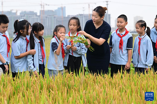 10月15日,江蘇省太倉市港城小學(xué)老師為孩子們講解水稻生長知識(shí)。(新華社發(fā) 計(jì)海新 攝)