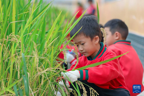 10月15日,云南省曲靖市陸良縣大莫古鎮(zhèn)中心幼兒園的孩子們在校內(nèi)勞動(dòng)基地體驗(yàn)收稻谷。(新華社發(fā) 王勇 攝)