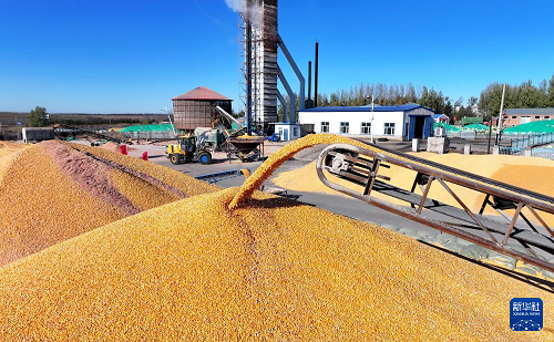 10月23日在北大荒集團(tuán)黑龍江尾山農(nóng)場有限公司一烘干企業(yè)拍攝的玉米烘干作業(yè)現(xiàn)場(無人機(jī)照片)。(新華社發(fā) 陸文祥 攝)