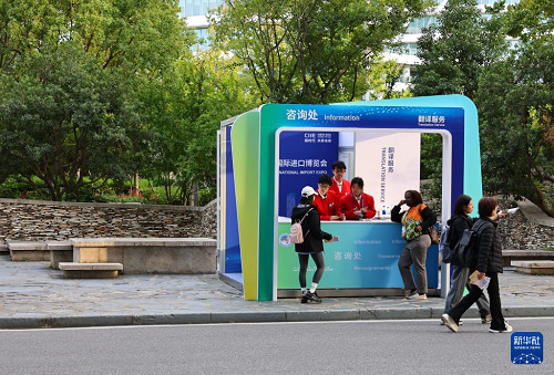 11月3日,志愿者在國(guó)家會(huì)展中心(上海)的一個(gè)咨詢(xún)處內(nèi)工作。(新華社記者 方喆 攝)