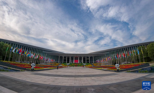 這是裝飾一新的國(guó)家會(huì)展中心(上海)南廣場(chǎng)(11月3日攝)。(新華社記者 方喆 攝)