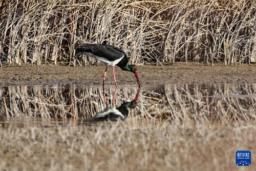 11月12日,黑鸛在張掖黑河濕地國(guó)家級(jí)自然保護(hù)區(qū)高臺(tái)段一處濕地淺灘覓食。(新華社記者 郎兵兵 攝)
