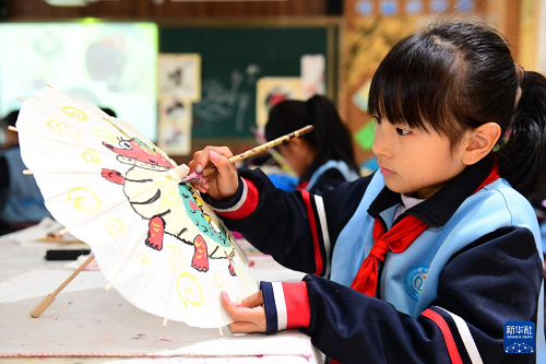 11月25日,在濟(jì)南市市中區(qū)愛(ài)都小學(xué),一庭香國(guó)畫社團(tuán)的學(xué)生在畫畫。(新華社記者 郭緒雷 攝)