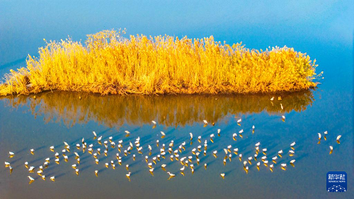 12月8日,群鳥在江蘇興化里下河國家濕地公園內(nèi)棲息、覓食(無人機(jī)照片)。(新華社發(fā) 周社根 攝)
