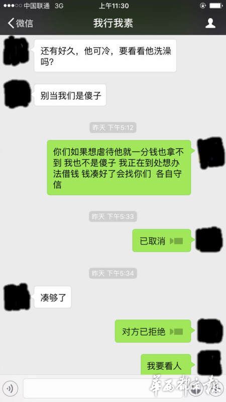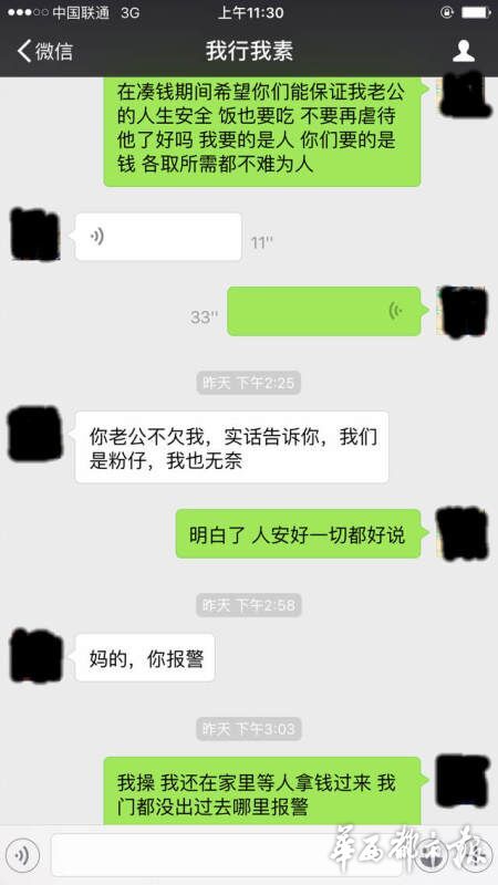 趙婷用微信與丈夫聯(lián)系,回復(fù)的人卻變成了“綁匪”,索要6萬(wàn)元的贖金,否則撕票。趙婷說(shuō),一定會(huì)湊錢,但要保證王江的人生安全,不能虐待,各取所需都不為難人,“綁匪”卻一直逼問(wèn)著錢的下落,并煞有其事地強(qiáng)調(diào)“不要報(bào)警”。