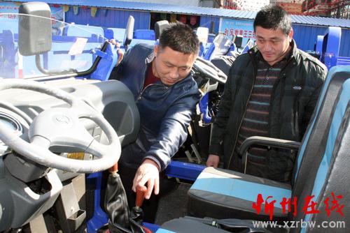 2月20日,原平市子干村的農(nóng)民正在農(nóng)機銷售處挑選時風農(nóng)用車,春節(jié)過后,該市農(nóng)機市場紅紅火火,農(nóng)民們早備耕,為今年的春耕生產(chǎn)打下良好基礎(chǔ)。(趙春曉 攝)