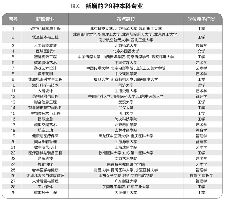 據(jù)悉,此次增設(shè)的29種新專業(yè),充分體現(xiàn)國家戰(zhàn)略、市場(chǎng)需求和科技發(fā)展?fàn)恳?,在服?wù)國家戰(zhàn)略方面,增設(shè)了區(qū)域國別學(xué)、碳中和科學(xué)與工程、海洋科學(xué)與技術(shù)、健康與醫(yī)療保障等專業(yè);面向科技發(fā)展前沿,增設(shè)了智能分子工程、醫(yī)療器械與裝備工程、時(shí)空信息工程等專業(yè);主動(dòng)適應(yīng)市場(chǎng)需求,增設(shè)了國際郵輪管理、航空運(yùn)動(dòng)等專業(yè)。同時(shí),聚焦人工智能賦能經(jīng)濟(jì)社會(huì)發(fā)展,增設(shè)人工智能教育、智能視聽工程、數(shù)字戲劇等專業(yè)。