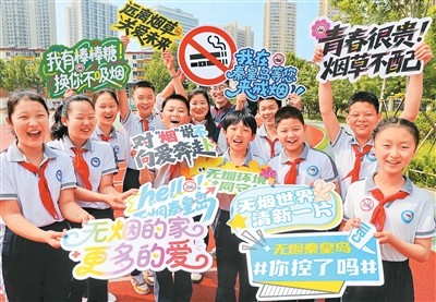 第38個(gè)“世界無(wú)煙日”到來(lái)之際,河北省秦皇島市疾控中心(市衛(wèi)生監(jiān)督所)工作人員走進(jìn)秦皇島市第七中學(xué)玉龍灣校區(qū),為學(xué)生普及吸煙有害健康的相關(guān)知識(shí)。圖為工作人員和學(xué)生共同和禁煙標(biāo)識(shí)、標(biāo)語(yǔ)合影。曹建雄攝(人民視覺(jué))