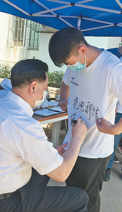 華中科技大學校史館旁,豎起一面“小清新”風格的迎新標語,“愿你歷盡千帆,歸來仍是少年”,畢業(yè)生們紛紛駐足留影。在韻苑12棟樓下的遮陽棚里,應(yīng)光電學院畢業(yè)生劉一哲的請求,校長李元元拿起簽字筆,在其文化衫上寫下祝福語。