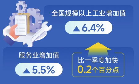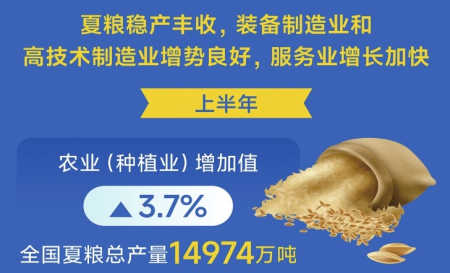夏糧穩(wěn)產(chǎn)豐收,裝備制造業(yè)和高技術(shù)制造業(yè)增勢良好,服務(wù)業(yè)增長加快。上半年,農(nóng)業(yè)(種植業(yè))增加值同比增長3.7%,全國夏糧總產(chǎn)量14974萬噸;全國規(guī)模以上工業(yè)增加值同比增長6.4%,其中裝備制造業(yè)增加值同比增長10.2%,高技術(shù)制造業(yè)增加值增長9.5%,增速分別快于全部規(guī)模以上工業(yè)3.8和3.1個(gè)百分點(diǎn);服務(wù)業(yè)增加值同比增長5.5%,比一季度加快0.2個(gè)百分點(diǎn)。