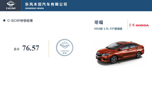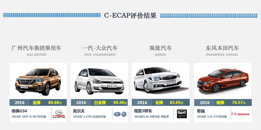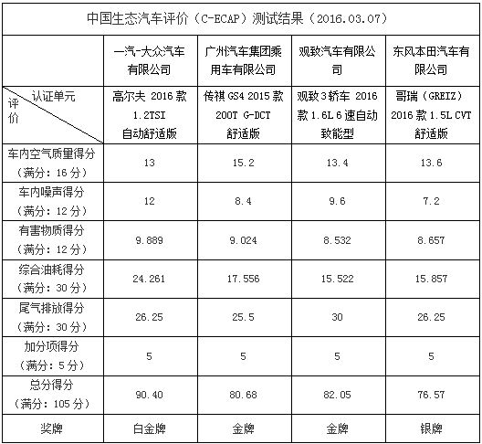 人民網(wǎng)天津3月9日電(鄂智超)日前,中國(guó)生態(tài)汽車(chē)評(píng)價(jià)(C-ECAP)新一批測(cè)試結(jié)果公布。本次共公布了四款車(chē)型,分別為一汽-大眾高爾夫 2016款 1.2TSI自動(dòng)舒適版(90.40分)、廣汽傳祺GS4 2015款 200T G-DCT舒適版(80.68分)、觀致3轎車(chē) 2016款1.6L 6速自動(dòng)致能型(82.05分)、東風(fēng)本田哥瑞 2016款1.5L CVT舒適版(76.57分)。其中一汽-大眾高爾夫車(chē)型獲得白金牌,廣汽傳祺GS4與觀致3轎車(chē)獲得金牌,東風(fēng)本田哥瑞獲銀牌。