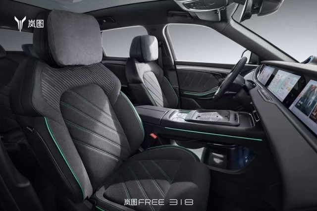 嵐圖FREE 318的內(nèi)飾主要采用了全新的黑+綠配色,大量觸感出色的軟性材質(zhì),滿足視覺和觸覺雙重質(zhì)感,新車不僅搭載了能夠滿足當下的智能化體驗,像前排座椅頭枕等也進一步提升了視覺體驗。