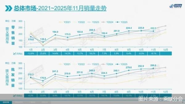 車市正進入平穩(wěn)發(fā)展階段。12月8日,中國汽車流通協(xié)會乘用車市場信息聯(lián)席分會(以下簡稱“乘聯(lián)分會”)發(fā)布的數(shù)據(jù)顯示,2025年前11個月零售2148.3萬輛,整體保持增長。不過,今年11月車市零售量同比、環(huán)比均出現(xiàn)下滑?!?1月乘用車市場銷量環(huán)比出現(xiàn)下降,是比較少見的。”乘聯(lián)分會秘書長崔東樹認為,今年上半年,我國乘用車市場銷量實現(xiàn)較快增長,下半年車市增長需回到合理、穩(wěn)定的狀態(tài)。車市進入平穩(wěn)期有利于市場長期穩(wěn)定發(fā)展,預計今年零售將增長5%。