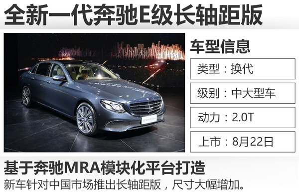 全新一代奔馳E級長軸距于上個(gè)月在北京奔馳亦莊工廠正式下線,新車針對中國市場的需求進(jìn)行了全面優(yōu)化,從外觀、內(nèi)飾到車身尺寸都有明顯提升。網(wǎng)通社從梅賽德斯-奔馳官方了解到,全新一代奔馳E級長軸距版將于8月22日在北京正式上市。新車采用不同調(diào)校的2.0T發(fā)動(dòng)機(jī),并首次搭載9速自動(dòng)變速箱。