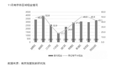 從南京我愛我家研究院針對2018年10月至2019年11月的租金統(tǒng)計中不難看出,今年7月前南京的租賃市場價格相對平穩(wěn),波動不大,而在7月、8月、9月呈現(xiàn)出高位震蕩的市場走勢,房屋租金水平在4個月內(nèi)又回到過去的平均水平線上。從各區(qū)的租金來看,除了浦口、雨花臺租金微漲外,其余各區(qū)租金在11月均有所下滑,其中,建鄴區(qū)的套均租金為3920元,跌破“4”字頭,每平方米的平均租金為52.8元,繼續(xù)排在全市第一;鼓樓區(qū)11月的套均租金為3363元,環(huán)比下滑51元,每平方米的平均租金為50.9元,位居第二;棲霞區(qū)的套均租金3285元,秦淮區(qū)套均租金3148元,分列第三、四位。
