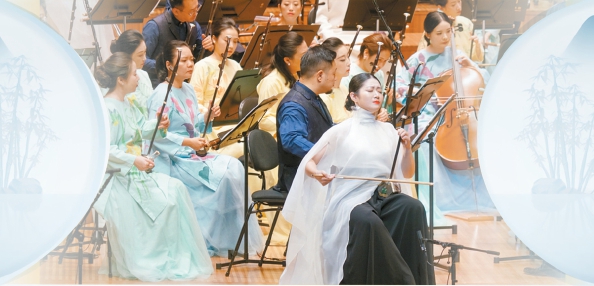 演出由知名華人指揮家湯沐海執(zhí)棒,來自上海民族樂團(tuán)的70余位演奏家一同奏響華章?!昂I仙駱贰狈忠魳窌婧蜕虾R魳窂d駐場版,前者偏向西方當(dāng)代交響音樂會的制式,后者則融入多媒體光影,更傾向于沉浸式音樂現(xiàn)場。因而,曲目會根據(jù)現(xiàn)場環(huán)境和觀眾特征做適當(dāng)調(diào)整。國外演出時,會增加二胡與樂隊(duì)合奏的《臥虎藏龍》(見上圖)——這是東西方觀眾都熟悉,甚至?xí)谘矍案‖F(xiàn)出竹林搖曳畫面的曲目。音樂會版在編曲上的處理會在尾聲處以漸強(qiáng)手法處理中西樂器的合奏共鳴,把情感推向高潮。琵琶、京胡與樂隊(duì)合奏的《楚漢》中,俞冰的琵琶獨(dú)奏氣勢不凡,凸顯出西楚霸王的威武。嗩吶與樂隊(duì)合奏《鳳舞》時,胡晨韻不僅能吹出一個超乎常人想象的長音,還能與笛子手等一起營造一群鳥兒的生動“對話”,時而平和時而激動,惹得觀眾忍俊不禁。而改編自膾炙人口的《野蜂飛舞》的民樂重奏《蜂飛》則賦予俄羅斯作曲家里姆斯基-科薩科夫的經(jīng)典名曲“中華風(fēng)韻”——眼見著民族樂器在王音睿、趙臻、丁龍等掌控的打擊樂、笙和二胡的樂音中展現(xiàn)出妙趣橫生的“畫面”。而開場,金鍇與趙韻夢領(lǐng)銜的竹笛與樂隊(duì)合奏《湖光》則凸顯出江南文化的音樂聲色。