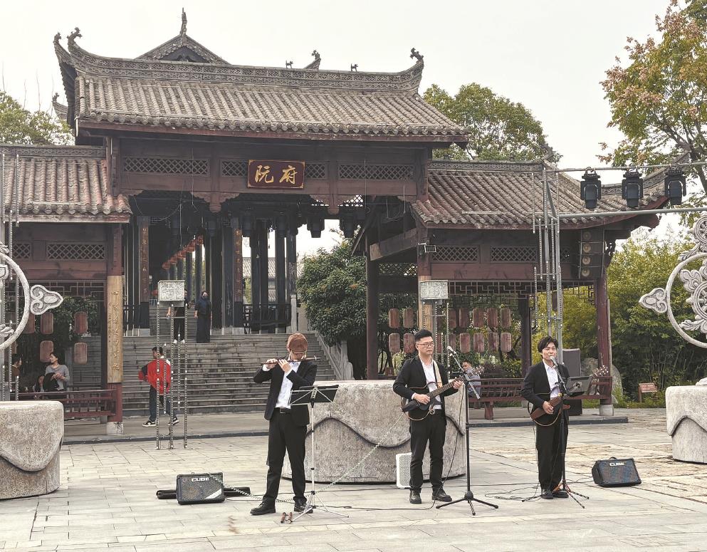 演藝新空間向外擴(kuò)展,蕪湖鳩茲小鎮(zhèn)內(nèi),上海街藝音樂(lè)組合正在演出。文匯報(bào)記者 孫彥揚(yáng)攝