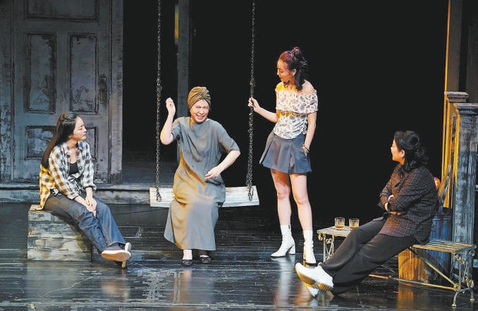 北京人藝話劇《小郡之秋》劇照,龔麗君飾演的母親(左二)與陳小藝(右一)、張培(左一)、原雨(右二)飾演的三個女兒在一起。記者 方非攝