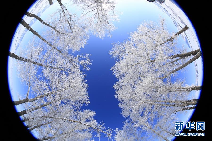 1月3日在新疆阿勒泰地區(qū)富蘊(yùn)縣吐?tīng)柡猷l(xiāng)拍攝的霧凇美景。藍(lán)天映襯下的冰雪世界顯得一片肅穆。 新華社發(fā)(丁寧 攝)