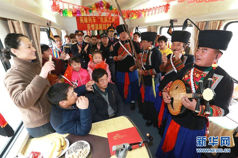 2月1日,彝族藝術(shù)家在K165次列車上為旅客表演。當(dāng)日,在西安鐵路局西安至昆明的K165次列車上,四川美姑縣原生態(tài)畢摩樂隊(duì)與西安客運(yùn)段職工民樂小分隊(duì)聯(lián)合舉辦“英雄列車民族之聲親情溫暖回家路”音樂會,畢摩樂隊(duì)用口弦、哈門、木葉、瑪布等彝族民間樂器演奏的音樂為返鄉(xiāng)過年的旅客提前送上新年祝福。民間藝術(shù)家和列車乘務(wù)員還為旅客們送上“福”字、春聯(lián)。新華社發(fā)
