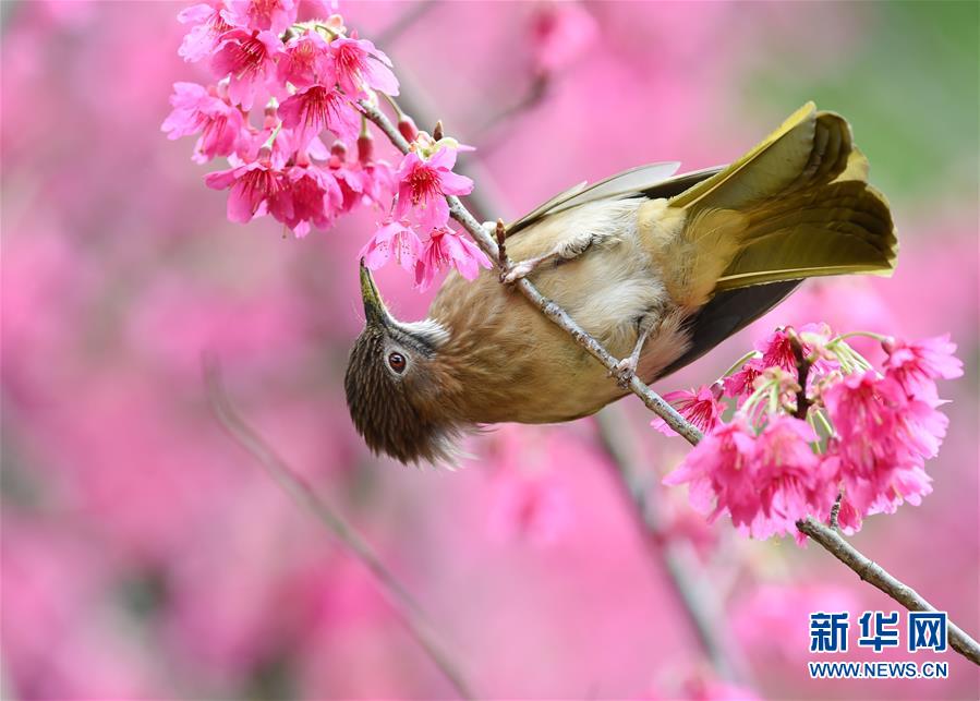 2月18日,一只綠翅短腳鵯鳥(niǎo)在福州森林公園櫻花園采食花蜜。隨著天氣轉(zhuǎn)暖,福州國(guó)家森林公園的2.5公頃櫻花園內(nèi)櫻花盛開(kāi),引得眾多鳥(niǎo)兒前來(lái)采食花蜜,春色盎然。 新華社記者 姜克紅 攝