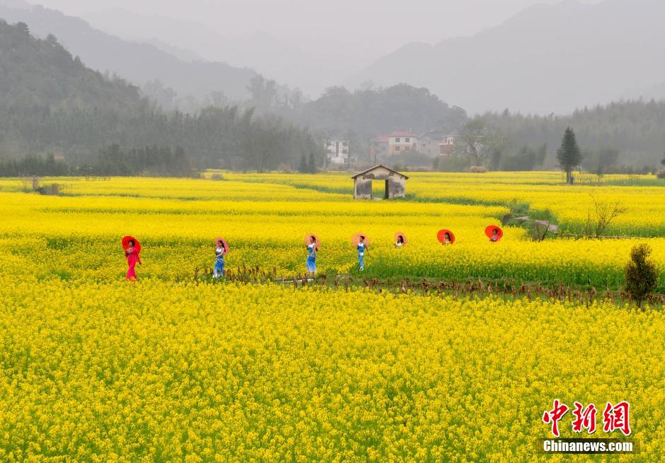 3月20日,江西省德興市??阪?zhèn)杜村婦女在田間花海“走秀”。當(dāng)日,江西德興市??阪?zhèn)杜村一批家庭婦女以千畝油菜花海為舞臺(tái),展示自己的才藝形象,希望宣傳家鄉(xiāng)的自然生態(tài)與人文歷史,擴(kuò)大旅游知名度和影響力。德興市??阪?zhèn)杜村交通便利,自然風(fēng)光優(yōu)美,村內(nèi)有歷史古跡和名木古樹(shù)。 胡敦煌 攝