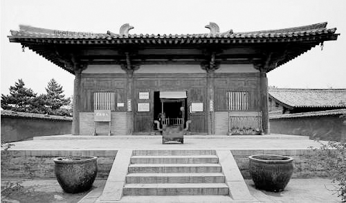 南禪寺位于山西五臺(tái)縣城西南22公里李家莊西側(cè)。坐北向南,有山門、龍王殿、菩薩殿和大佛殿等主要建筑,圍成一個(gè)四合院形式。創(chuàng)建年代不詳,大殿平梁下保存有墨書題記,足證重建于唐建中三年(782)。晚唐時(shí)武宗“會(huì)昌滅法”幸免毀壞,是我國(guó)現(xiàn)存最古的唐代木構(gòu)建筑。大殿面寬進(jìn)深各三間,單檐歇山式屋頂,殿前有寬敞的月臺(tái),柱上安有雄健的斗拱,承托屋檐,殿內(nèi)無柱,四椽桴通達(dá)前后檐柱之外,梁架結(jié)構(gòu)簡(jiǎn)練,屋頂舉折平緩。說明我國(guó)唐代建筑技術(shù)已有很高水平,而且已普及到偏僻山村。