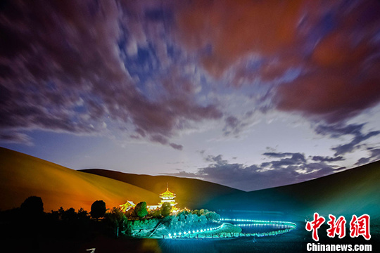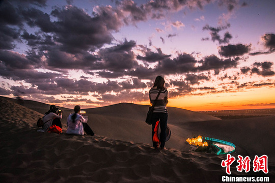 7月中旬,國際旅游名城甘肅敦煌進(jìn)入旅游旺季,每天成千上萬的海內(nèi)外游客來到當(dāng)?shù)刂Q沙山月牙泉景區(qū)觀光游覽,觀賞大漠風(fēng)光,感受敦煌文化,體驗民俗風(fēng)情。傍晚時分,西邊的天空被晚霞染紅,美麗的月牙泉被寶藍(lán)色的燈光點綴著呈現(xiàn)出美輪美奐的闌珊夜色,大批游人沉浸于如夢如幻的迷人夜色里流連忘返。