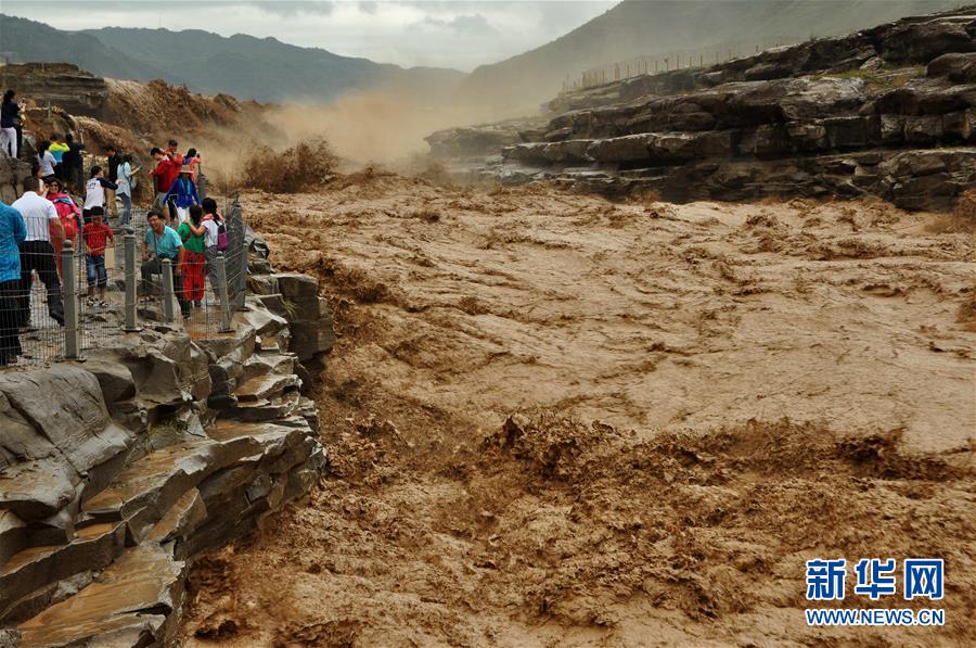 受上游強(qiáng)降雨影響,黃河壺口瀑布水勢(shì)大漲,主副瀑布連成一片。