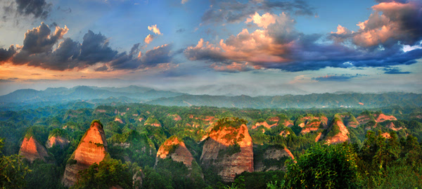 萬(wàn)佛山地處云貴高原向南嶺山地的過(guò)渡地帶。經(jīng)數(shù)以億年的流水、風(fēng)化地質(zhì)作用,逐漸發(fā)育呈現(xiàn)出丹霞赤壁、石嶺、石寨、石柱、石橋、一線天、狹谷、溝巷等奇特的丹霞地貌自然景觀。域內(nèi)丹霞峰林拔地而起,巍巍陣列,尤如一幅天然水墨長(zhǎng)卷。登臨萬(wàn)佛山主峰山頂,俯視峰林,氣勢(shì)磅礴,向西南可望海神龜活神活現(xiàn);向北望毛蠟燭峰、天書(shū)巖、夫妻巖形象逼真;向南可遠(yuǎn)眺將軍山主峰及該將軍山景區(qū)螺絲峰和神仙洞景區(qū)大寨巖主峰及神仙山主峰。群峰列陣,萬(wàn)佛朝宗,不愧為“丹霞群峰第一山”。
