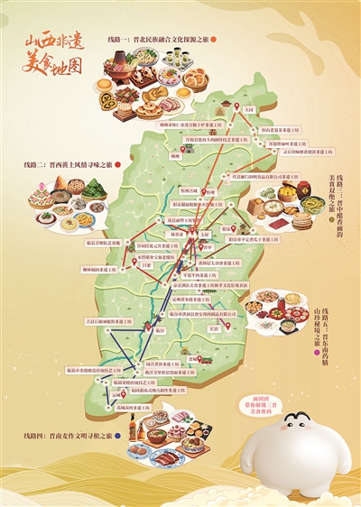 這5條非遺美食線路以“晉商文化”“面食王國(guó)”“藥膳康養(yǎng)”等為主題,以3日游或4日游為主,包括晉北民族融合文化探源之旅、晉西黃土風(fēng)情尋味之旅、晉中醋香面韻美食雙絕之旅、晉南麥作文明尋根之旅、晉東南藥膳山珍秘境之旅,覆蓋醋釀、面藝等30余項(xiàng)省級(jí)以上非遺美食項(xiàng)目,串聯(lián)起太原、大同、長(zhǎng)治等全省11市30多個(gè)非遺工坊以及眾多歷史街區(qū)、自然景觀,形成“美食+非遺+景區(qū)”的立體化文旅線路。
