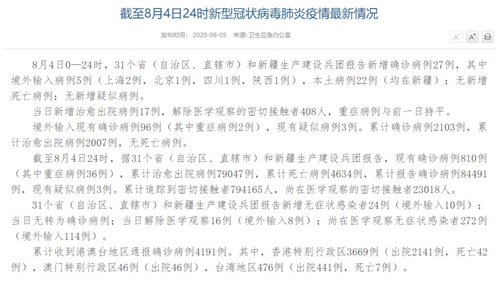情況顯示,截至8月4日24時(shí),據(jù)31個(gè)省(自治區(qū)、直轄市)和新疆生產(chǎn)建設(shè)兵團(tuán)報(bào)告,現(xiàn)有確診病例810例(其中重癥病例36例),累計(jì)治愈出院病例79047例,累計(jì)死亡病例4634例,累計(jì)報(bào)告確診病例84491例,現(xiàn)有疑似病例3例。累計(jì)追蹤到密切接觸者794165人,尚在醫(yī)學(xué)觀察的密切接觸者23018人。