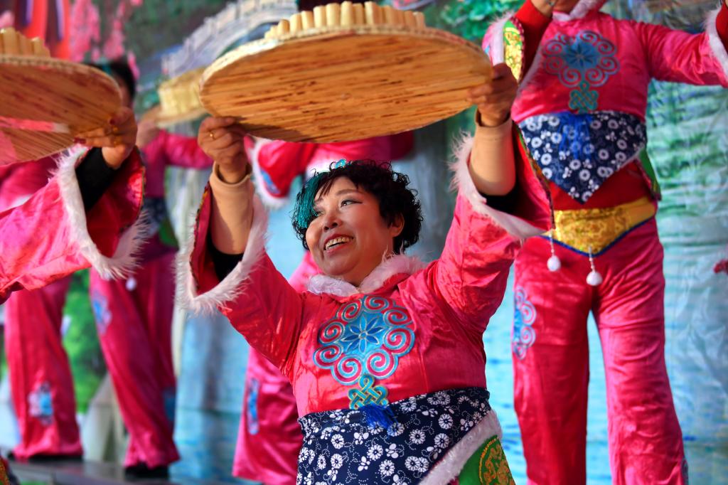 ↑1月3日,在山西省渾源縣荊莊村,渾源縣貧困山區(qū)合唱團(tuán)在表演歌舞《看山看水看中國》。