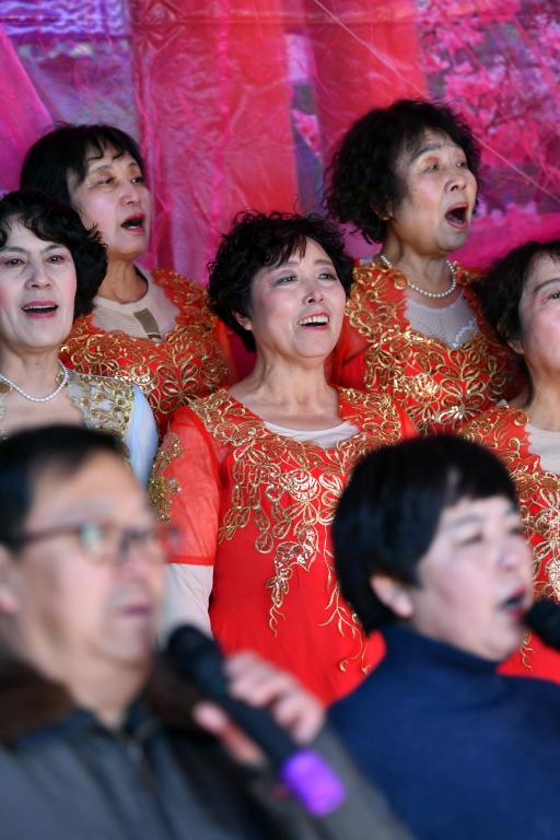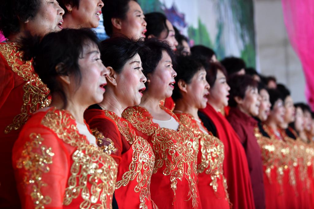 ↑1月3日,在山西省渾源縣荊莊村,渾源縣貧困山區(qū)合唱團(tuán)在表演大合唱《祝福祖國》。