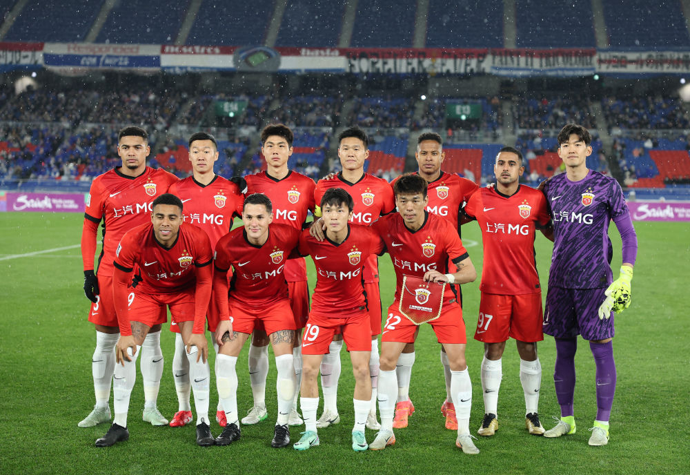 3月11日,上海海港隊(duì)首發(fā)球員在比賽前合影。新華社記者 賈浩成 攝