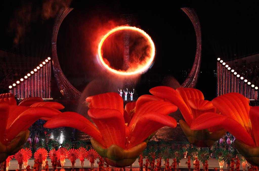 新華社廣州11月10日電(記者王浩明、趙紫羽、田宇)9日晚,廣東奧林匹克體育中心,十五運會的開幕式在這里舉行,當(dāng)十五運會主火炬塔“天海之冠”被三地健兒共同點亮那一剎,燈火輝煌,掌聲雷動。