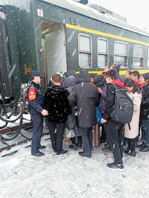 1月5日,五寨縣普降大雪。五寨火車(chē)站派出所民警冒雪維護(hù)秩序,指揮疏導(dǎo)交通,確保旅客在客流高峰期安全乘車(chē)。(索效剛 攝)
