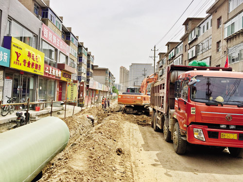 因?yàn)闅庀锬舷锫访孑^窄,地下雨水和污水管線的施工采用的是同槽開(kāi)挖下埋。溝槽深度4米、寬度3.5米,雨水管線采用直徑分別為0.8米和1.2米的玻璃夾砂鋼管,污水管線采用直徑為50厘米的玻璃夾砂鋼管。為了安全,施工隊(duì)將開(kāi)槽、下管和回填同步進(jìn)行。