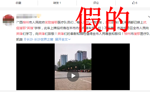 在一些微信群里,“柳州市獎勵援鄂醫(yī)療隊員們,每人獎勵一輛汽車,獎勵的車門上每輛都已噴上抗疫援鄂‘英雄’字樣,此車上牌后終身在本市內(nèi)任何停車場(位)不收費”的信息比比皆是。在抖音和微博平臺,還有不少網(wǎng)友以該信息為基礎,配上了迎接援鄂抗疫英雄回柳的畫面,制作成了短視頻在網(wǎng)絡上傳播,加劇了虛假信息進一步傳播。