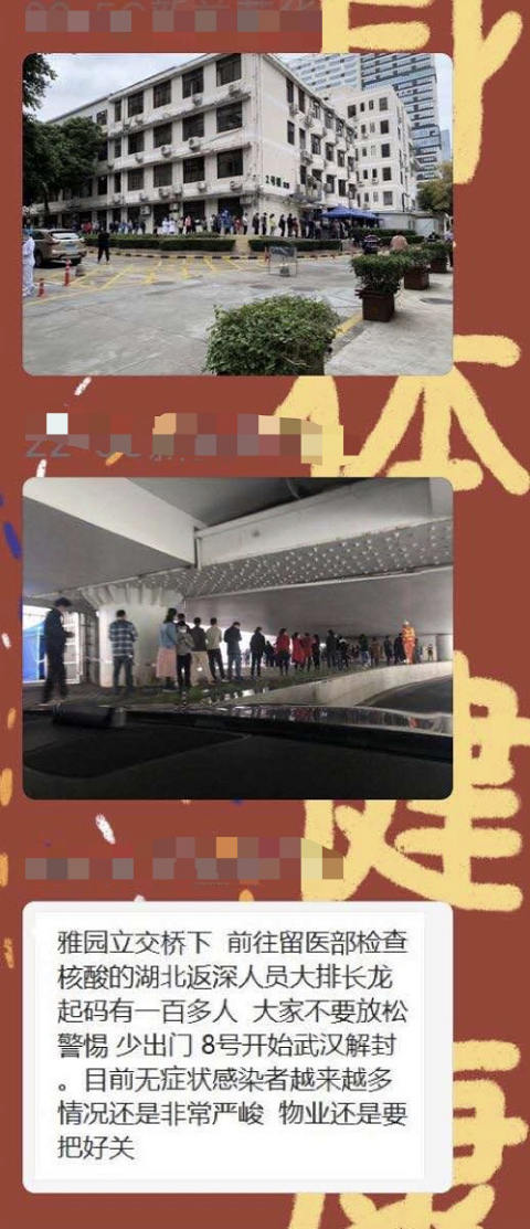 “雅園立交橋下,前往留醫(yī)部檢查核酸的湖北返深人員大排長(zhǎng)龍,起碼有一百人,大家不要放松警惕,少出門。”7日,這段文字和兩張大排長(zhǎng)龍的圖片在網(wǎng)上流傳。記者9日從深圳市人民醫(yī)院獲悉,該情況并不屬實(shí)。一份核酸取樣平均時(shí)間為數(shù)秒鐘,醫(yī)院核酸檢測(cè)排隊(duì)患者一般在10~50人之間,因?yàn)樾枰3?米隔離,隊(duì)伍會(huì)比較長(zhǎng),但也未超過(guò)百米,更不存在排出醫(yī)院大門外或雅園立交橋下,市民無(wú)需緊張。